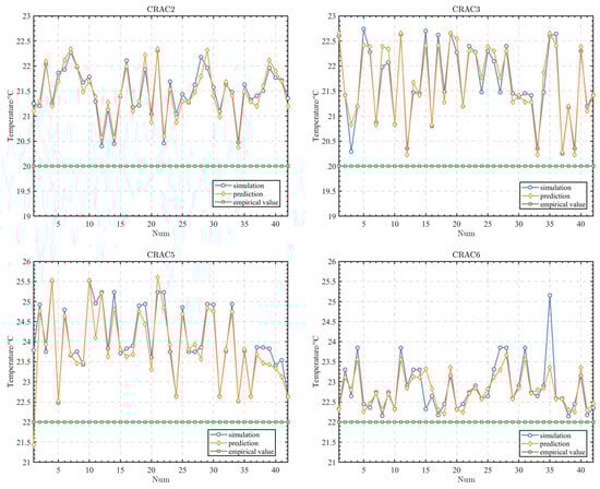 Figure 13 shows the relationship between the predicted results of the four graph models and the simulation results. It is evident that the predicted temperatures for ACU2 and ACU3 are generally higher than the empirically set temperature of 20 °C, and those of ACU5 and ACU6 are generally higher than the empirically set temperature of 22 °C. The overall deviation between the predicted and simulation values is within the allowable error of ±0.5 °C for CRACs in data centers. Although there are some individual data points with significant deviations, they do not affect the overall performance.