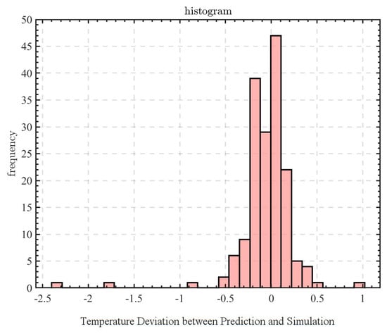 Figure 14 visualizes the deviation between the predicted and simulation values for the 168 test set data points. As shown in the figure, 161 data points exhibit a difference ≤ ±0.5 between the predicted and target values, accounting for 95.83% of all predictions, while 7 data points display a deviation greater than 0.5. Generally, an error of CRACs in data centers within ±0.5 °C is considered normal [16]. Therefore, the model’s prediction of the air outlet temperature for the CRACs meets the accuracy requirements.