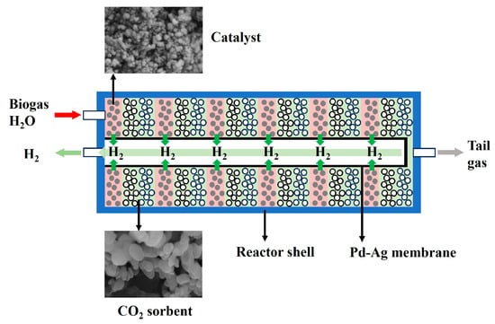 The primary methods for hydrogen production from biogas include steam reforming, partial oxidation reforming, autothermal reforming, dry reforming, and dry oxidative reforming [20]. Among these, steam reforming is the most predominant and mature hydrogen production process, which amplifies hydrogen yield via the contribution of water in both steam reforming and water–gas shift reactions [21]. Due to the endothermic nature of steam biogas reforming (SBR), high temperatures are typically required to promote methane conversion [22,23]. Tuna et al. reported an experimental study on biogas steam reforming using a 7.4% Ni/γ-Al2O3 catalyst, achieving a high methane conversion and a hydrogen yield of 60% at 850 °C [24]. Chouhan et al. conducted a simulation study on biogas steam reforming in an industrial reformer, obtaining a methane conversion of 95.96% and a hydrogen production of 1.04 mol-H2/mol-BG at 900 °C [25]. The high-temperature conditions and endothermic properties of the reaction usually require fuel combustion as the heat source [26], resulting in high energy consumption for H2 production and significant CO2 emissions. In addition, conventional SBR only produces a gas mixture of H2, CO and CO2, limiting its applicability in a wide range of technologies such as fuel cells. Therefore, downstream processes such as the water–gas shift reaction (WGS) and pressure swing adsorption (PSA) are required to obtain high-purity hydrogen, resulting in a complex hydrogen production system [27].