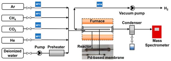 The experimental system is illustrated in Figure 2. Since impurities in real biogas, such as H2S, NH3, and siloxanes, readily cause catalyst deactivation [27], and given that these impurities can be effectively removed by mainstream biogas upgrading technologies (e.g., desulfurization, adsorption) [42], simulated biogas (60 vol% of CH4 and 40 vol% of CO2) is employed in our experiments rather than actual biogas. Simulated biogas is introduced into the reactor through the mass flow controller (MFC), where argon serves as an internal standard gas for gas flow measurement in mass spectrometry and does not participate in the reactions. Helium serves as a purge gas for hydrotalcite regeneration. A constant flow pump regulates the flow of deionized water, and liquid water is evaporated to steam by a preheater. The electric heating furnace provides a constant temperature for the reactor in the chamber. The reactor tail gas passes through a glass condenser to condense excess water vapor, after which the gas composition is analyzed via mass spectrometry. A vacuum pump creates the pressure difference needed for H2 permeation through the Pd-based membrane, with the flow rate of high-purity H2 measured by a gas mass flow meter (MFM).