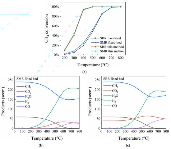 Thermodynamic analysis of SMR and SBR. (a) Effect of temperature on the CH4 conversion rate; (b) Evolvement of both reactant and product species of SMR without separation; (c) Evolvement of both reactant and product species of SBR without separation (CO2/CH4 mole ratio: 0.66, S/C mole ratio: 4).