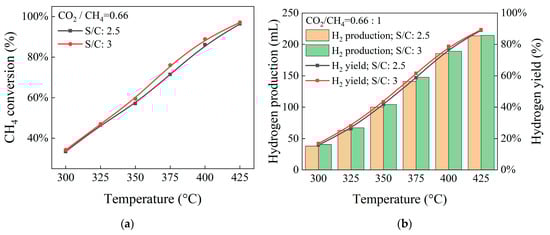 Influence of temperature on the multi-product separation SBR (S/C of 2.5 and 3, CO2/CH4 ratio of 0.66, 1 bar). (a) CH4 conversion; (b) H2 production and H2 yield.