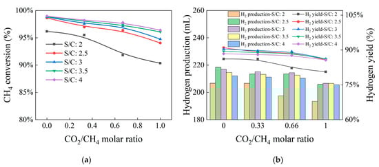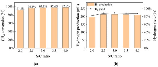 The conversion performance of methane in biogas versus the S/C ratio is then investigated experimentally. It is well known that the steam-to-methane ratio plays an important role in promoting the conversion performances of methane in conventional SMR. Our study shows that the same trend holds for biogas also in terms of its methane conversion with respect to the S/C ratio. As shown in Figure 5a, methane conversion demonstrates a monotonic increase in the S/C ratio range between 2.0 and 4.0. In particular, the conversion increases by 4.6 percentage points when the S/C ratio increases from 2.0 to 2.5, while the increase magnitude is much smaller when the S/C ratio goes beyond 2.4. The possible reason for such behavior is likely that the S/C ratio of 2.0 (the theoretical stoichiometric coefficient of water in the global methane reforming reaction) is very low. Due to the tendency of methane decomposition and the Boudouard reaction (2CO = C + CO2) on nickel-based catalysts, using a stoichiometric or even lower S/C ratio will result in severe carbon deposition on the reforming catalysts [47,48,49]. Therefore, a higher S/C ratio favors a higher methane conversion rate. A higher steam flow rate promotes the SMR and the WGS reaction, increasing H2 and CO2 yields. However, when the steam flow exceeds a certain threshold (S/C ratio of 2.5), the amount of unreacted steam also increases, leading to a slight decrease in the partial pressures of hydrogen and CO2 in the product gas, adversely affecting product separation.