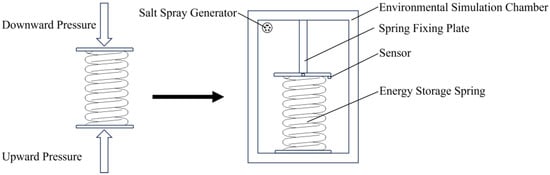 Circuit breaker equipment in coastal areas may also be affected by salt spray corrosion. Therefore, the test chamber is equipped with a salt spray generator, which allows for adjustable salt spray concentration (1–10% NaCl) and spray frequency. The selection of this concentration range is based on the industry standard GB/T 2423.17-2008 [12] for salt spray testing of power equipment, which specifies 3–5% NaCl as the typical concentration for simulating coastal environmental conditions. To assess the corrosion effects under both moderate and extreme conditions, we extended the testing range to 1–10% NaCl. During the testing period, the spring’s stress and closing behaviors are measured at a regular interval (every half-month or month) to monitor its performance degradation.