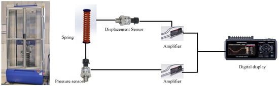In order to analyze the mechanical response of the spring under the long-term working condition, the repeated closing and opening operation is generally required to evaluate the spring’s elastic recovery capability and mechanical properties under varying operation cycles. In Figure 2, an accelerated test was carried out using the tension compression testing machine (Model: SDS-1000, Changchun Institute of Mechanical Science Co., Ltd., Changchun, China) at a fixed frequency of 0.1 Hz (i.e., 360 cycles per hour). The machine was operated continuously for 17 h per day over a 5-day period, reaching a total of approximately 30,000 cycles. In every cycle, the spring was compressed to its standard working height (from H1 to H2) and then released, simulating the complete energy storage and release process that occurs during a typical closing operation of the circuit breaker. Meanwhile, the displacement and pressure sensors were also installed in the accelerated test machine to ensure the accuracy and reliability of the measurements.