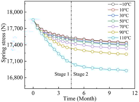 As shown in Figure 3, the stress relaxation process of high-voltage circuit breaker springs at different temperatures can be divided into two stages. In the first stage (the initial 4 months), the slope of the stress curve is relatively large, indicating a rapid decay in stress, while in the second stage (4 to 11 months), the slope of the curve gradually decreases, suggesting a slower rate of stress decay. Moreover, when the temperature is between −10 °C and 70 °C, the effect of temperature on the stress change of the spring is very small, but when the temperature exceeds this range, it can be clearly seen that the stress change of the spring becomes larger with the increase in temperature.