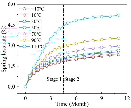 Figure 4 presents the variation in stress loss rate of the circuit breaker spring operating in the temperature range of −10 °C to 110 °C. It can be observed that, within the temperature range of −10 °C to 50 °C, the stress loss rate of the spring after 11 months of degradation falls within the interval of 2.33% to 2.64%. When the temperature increases to the extreme condition of 110 °C, the stress loss rate of the spring reaches 5.21%.