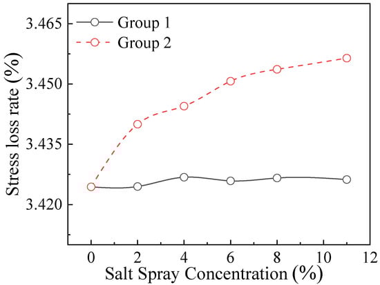 For 60Si2CrVA alloy steel springs, prolonged exposure to an environment with varying humidity or salt spray concentrations can lead to surface and internal corrosion, subsequently affecting their mechanical properties. In this study, the springs were subjected to varying concentrations of salt spray (1 wt%–10 wt% NaCl solution) at 30 °C for a period of 11 months, after which their final rate of stress loss was determined. The experiment involved two groups of different springs. In Group 1, springs were produced under normal manufacturing conditions, while in Group 2, the used springs with damaged electrophoretic paint on the surface were adopted. The results of the experiment are shown in Figure 5 and Figure 6.