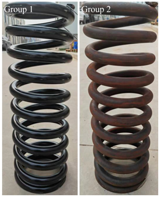 The surface of the springs in Group 1 coated with electrophoretic paint remained intact and presented effective corrosion resistance. Consequently, the stress loss rate of these springs does not show any obvious variation across the different salt spray concentrations. In contrast, the surface of the springs in Group 2 was significantly corroded after exposing to the salt spray environment, and the stress loss rate was also increased with the increase in the salt spray concentration. However, the stress loss rate of the corroded spring samples was only marginally higher (by approximately 0.01–0.03) than that in Group 1, which would not affect the mechanical properties of the springs. The reason for this minimal impact can be attributed to a specific corrosion process for the springs in Group 2. In the initial corrosion stage, the salt spray is in direct contact with the spring surface, resulting in a chemical reaction that produces a layer of red rust. This rust covers the spring surface to create a protective layer, which hinders further reaction between the salt spray solution and the metal substrate and thereby slows down the penetration of corrosion into the internal structure of the spring [15,16]. Moreover, the results showed that stress loss rate of springs of Group 2 was obviously corroded by the salt spray condition. However, in real working conditions, normal springs are almost fully coated with electrophoretic paint, and are hardly affected by salt spray corrosion [17].