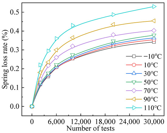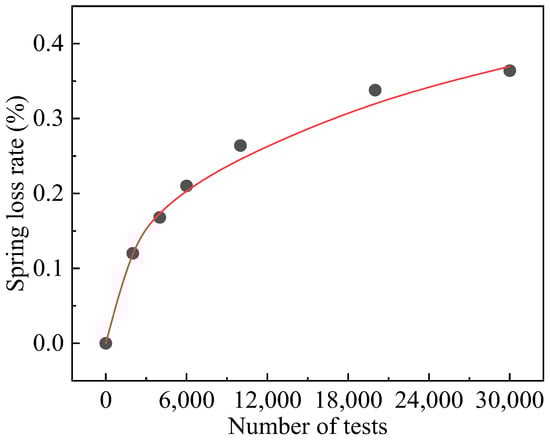 As shown in Figure 7, the power function curve illustrates the relationship between the stress loss rate of the spring and the number of closing operations. With rising temperature, the stress loss rate exhibits an upward trend. Especially, when the temperature exceeds 70 °C, the stress loss rate of the spring increases significantly, and the curve displays a more pronounced upward slope. After 30,000 simulated closing operations, the stress loss rates of the springs at temperatures of −10 °C, 10 °C, 30 °C, 50 °C, 70 °C, 90 °C, and 110 °C reach 0.342%, 0.354%, 0.36%, 0.387%, 0.414%, 0.454%, and 0.53%, respectively, which are all lower than the 4.5% stress loss rate threshold. This indicates that the stress loss rate during long-term spring closing operations exhibits minimal variation across different operating temperatures. By fitting the spring stress loss rate using the data tested at 30 °C, the following equation was derived: