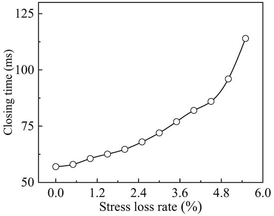 In this work, a stress loss rate of 4.5% is adopted as a conservative threshold for assessing the degradation of spring performance in high-voltage circuit breakers. This value was selected based on operational requirements, and the acceptable closing time was suggested to be maintained within 50–80 ms (Table 1). When the spring’s stress loss exceeds 4.5%, the closing time tends to surpass this limit, indicating that the spring is severely degraded. The experimental validation is provided in Section 5, where the relationship between closing time and stress loss rate is further discussed.