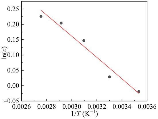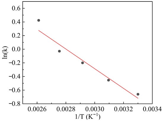 In Table 2, the coefficient of determination (0 ≤ r2 ≤ 1) is an important statistical indicator that was used to evaluate the fitting goodness of the regression model. A high R2 value indicates good linear fitting between the stress loss rate and the logarithmic time. In practical engineering applications, the operating temperature of high-voltage circuit breaker springs does not exceed 70 °C. According to Equation (4), the slope e =Ea/R and the intercept b = ln(A) of the linear equation can be obtained by fitting ln(k) and 1/T at this temperature. The fitting results are illustrated in Figure 10.
