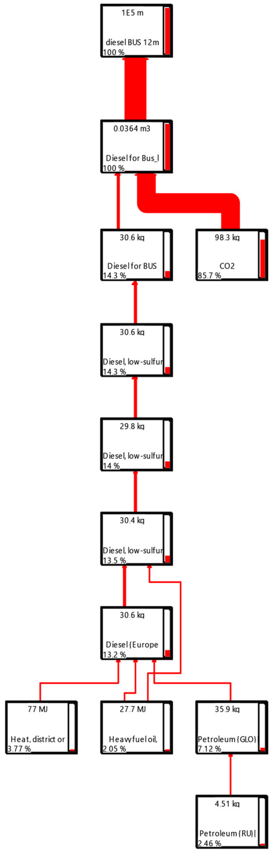 The system boundary established for purposes of the analyses performed for the buses featuring internal combustion engines comprised diesel fuel production and direct emissions over the course of the vehicle operation, including carbon dioxide emissions and on-route exhaust emissions according to individual Euro emissions standards. These requirements are set forth in international and European standards relating to vehicle emission levels, including those of city buses [35].