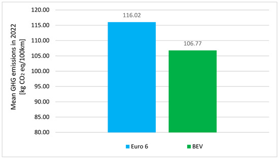 Based on the GHG emission rates established for the Euro 6 standard-compliant diesel buses (Figure 3) and electric buses (Figure 5), it has been found that in winter months, e.g., December and January, the GHG emissions generated by electric buses are actually greater. This is primarily due to the fact that diesel fuel consumption for heating in electric buses has been taken into account in the LCA-based analyses. However, analysis of the mean GHG rates established for the entire year 2022 (Figure 7) shows that electric buses produced 7.97% less of these emissions.