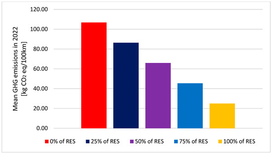Adding renewable energy sources to the energy mix used for charging of the batteries of electric buses brought a reduction in the total GHG emissions over the entire 2022 (Figure 9). For the RES fractions of 25%, 50%, and 75% in the energy mix, emission reductions of approx. 19%, 38%, and 57% were established, respectively. For an energy mix entirely derived from RESs, the reduction in emissions came to ca. 76% compared to Poland’s 2022 energy mix (Table 3). The GHG emission determinants for the 12 m electric buses, considering the RES share in the energy mix at the levels of 25%, 50%, 75%, and 100%, are shown in Figure 10.