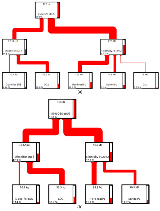 - The greatest benefits in terms of greenhouse gas emission reduction can be achieved in public bus transport by replacing conventionally powered vehicles with electric vehicles, yet only under the condition that the energy consumed to power them comes from renewable energy sources. Adding renewable energy sources to the energy mix used for charging electric bus batteries reduces total GHG emissions. For the RES fractions of 25%, 50%, and 75% in the energy mix, emission reductions of approx. 19%, 38%, and 57% have been achieved, respectively. For an energy mix entirely derived from RESs, the reduction in emissions comes to ca. 76% vis-à-vis Poland’s energy mix in 2022.