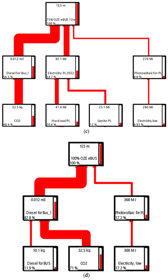 Determinants of GHG emissions from a 12 m electric bus relative to the share of RES: (a) 25%, (b) 50%, (c) 75%, (d) 100%. Source: authors’ own compilation.