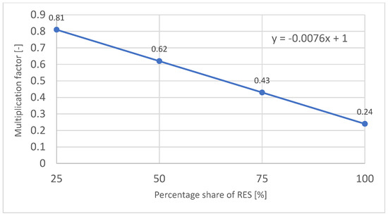 Values of the determined multiplier depending on the assumed percentage share of RESs in the form of solar energy. Source: authors’ own compilation.