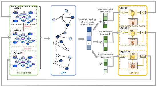DRL is an advanced method for solving MDP problems. The fundamental idea of DRL is to maximize the cumulative reward function assigned to a specific task through continuous interactions between the agent and the environment, e.g., power systems, ultimately learning the optimal strategy for performing the task. To address the challenge of efficient and stable DRL training for coordinating multiple agents in the power system’s OPF environment, the concept of a heterogeneous multi-agent system is introduced, along with the MAPPO algorithm. In addition, the GNN is introduced to extract the global spatial–temporal feature from the time series of state variables and the power grid topology, which will be used as part of the input of the DRL model.