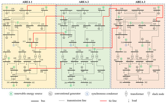 In 2019, the RTS-GMLC system was introduced as an updated version of the RTS-96 test system. The RTS-GMLC system aims to facilitate the study and analysis of challenges in modern power systems including the variability and uncertainty of generation fleets and the flexibility of dispatch processes such as unit commitment and economic dispatch under uncertainty. As shown in Figure 2, the RTS-GMLC system includes 73 buses, 158 generators, 121 branches, and 3 areas connected by 6 tie lines.