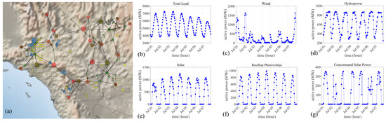 The RTS-GMLC system represents a high spatial and temporal resolution power system with high renewable penetration. For the RTS-GMLC system, monitoring, analysis, and control operations can be carried out with detailed generation, load, and grid topology data across both space and time. The high-resolution capability is essential for addressing the increasing complexity of power systems due to the integration of RESs. As shown in Figure 3a, the geographic location of the power network of the RTS-GMLC model is arbitrarily projected onto nearly 250 square miles in the southwestern United States. With the help of the data from balancing authorities and the Western Wind and Solar Integration Study 2 (WWSIS-2) dataset, the RTS-GMLC model provides a reference for load, solar, wind, rooftop photovoltaic, CSP, and hydrologic time-series [40]. The load and RES time series enable year-long simulations with hourly resolution, e.g., 24 data points each day. A one-week illustration of load and RES time series is shown in Figure 3b–g. Nevertheless, it should be noted that the RTS-GMLC system remains synthetic and does not represent a real-world power system [41].