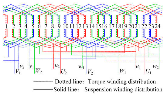 - Yang, Z.; Ding, Q.; Sun, X.; Lu, C. Design and Analysis of a Three-Speed Wound Bearingless Induction Motor. IEEE Trans. Ind. Electron. 2021, 69, 12529–12539. [Google Scholar] [CrossRef]