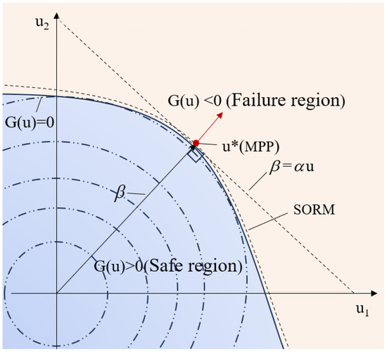where represents the row vector of the gradient, which linearizes the failure domain , i.e., the half-space defined by . The reliability index is defined as the minimum distance from the origin to the limit state surface in the standard normal space, and represents the normalized negative gradient vector at the design point. u* is the MPP on the boundary of the overload criterion function and represents the point most likely to lead to failure.
