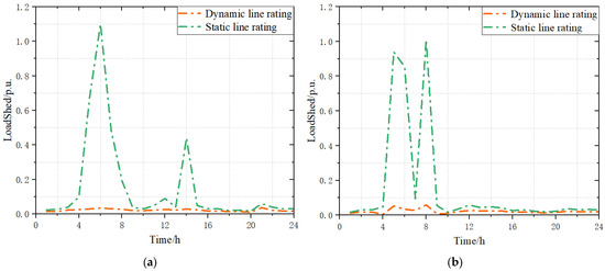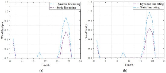 To verify the effectiveness of dynamic line rating technology in alleviating power flow congestion, this section selects two typical scenarios: normal system operation and Line 4 fault conditions. Using the system without DLR as the benchmark, we compare the wind curtailment levels, load shedding levels, and line ampacity capacities before and after implementing DLR technology. The comparative results are illustrated in Figure 4, Figure 5 and Figure 6.
