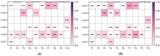 Comparison of line loadability levels under normal operation and Line 4 fault scenarios. (a) Line loadability level under normal operation scenario; (b) line loadability level under Line 4 fault scenario.