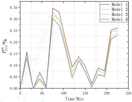 Furthermore, the case study results reveal that Line 6 has the highest risk concentration, followed by Line 1 and Line 2, whereas Lines 7 and 5 have relatively fewer high-risk scenarios. The peak overload probability risk for Line 1, which has a higher baseline overload probability level, increases from 0.282 to 0.343; this represents an increase of 21.6%. Similarly, the peak risk for Line 2 increases from 0.275 to 0.325; this represents an increase of 18.2%. For Line 6, the peak risk increases from 0.276 to 0.324; this represents an increase of 17%. Thus, the primary cause of higher overload levels is the significant power transmission burden on these lines during specific periods, along with the influence of environmental parameters; additionally, our results highlight the substantial amplifying effect of the component failures on the system risk. These findings emphasize the critical need to incorporate component failure scenarios in risk assessments to accurately capture and mitigate potential overload risks in power systems.