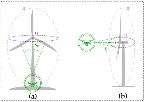 Determination of the UAV’s initial position around a WTC, shown from the front view (a) and the side view (b). The turbine center and an offset radius are used to define a safe starting location for the planned flight paths. Typically, matches or slightly exceeds the maximum blade length to ensure sufficient clearance from the rotor.