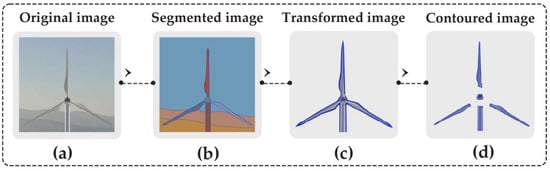 Once at , the UAV captures a high-resolution image . Detectron2 v0.6 [35] detects and segments blades, tower, and nacelle. Background removal yields , and function findContours from OpenCV v4.9.0 [36] filters out noise below an area threshold , as was introduced in [37]. This segmentation pipeline enables DyTAM to understand and interact with the turbine structure autonomously. Figure 4 schematically shows these steps.