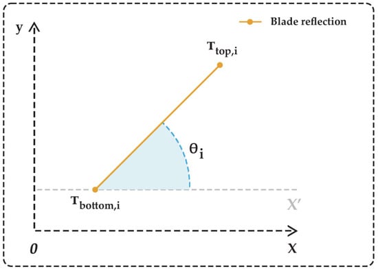 Figure 5 illustrates the pitch angle within a two-dimensional coordinate system. The angle is measured between the x-axis and the line connecting the blade’s bottom vertex () to its top vertex (). For enhanced clarity, the illustration includes the blade reflection and reference axes, aiding in the understanding of angle measurement and spatial orientation.