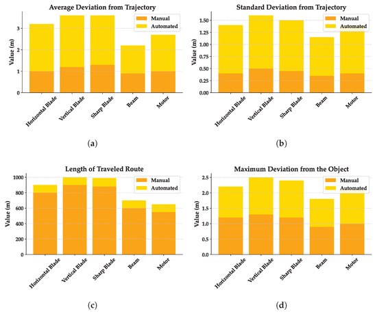 Visual comparison of key metrics for different WTC components under nominal conditions. Sub-figure display: (a) mean trajectory deviation, (b) standard deviation of trajectory, (c) total distance traveled, and (d) maximum deviation from the object. In each sub-figure, automated control (yellow bars) consistently demonstrates superior performance over manual control (orange bars), yielding tighter adherence to planned routes and shorter flight lengths.
