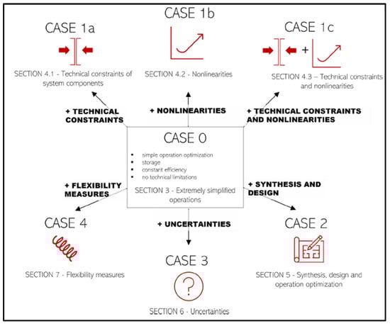 In general, and for Multi-Energy Systems (MES) even more, model complexity is a function of the detail adopted in the representation of each system component. More detail on components’ behaviors implies a more complex mathematical description. So, it is of paramount importance to understand which is the best compromise between the completeness of the mathematical representation of the system and the complexity of the resulting problem (which implies the kind of solver that can be used and the time of resolution or, in many cases, just whether the problem is numerically tractable with the present hardware and software or not). From this point of view, ref. [19] provides an interesting classification of the mathematical representation (and complexity) associated with the different modeling details treated in ME models. ME models are divided into seven categories (Figure 1). Table 2 shows the typical modeling criticalities of each category.