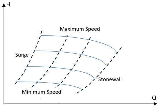Compressors have to operate within established limits, which are plate data of each device. A natural way to characterize the performance of centrifugal compressors is in terms of the inlet volumetric flow rate, speed, adiabatic head, and adiabatic efficiency. The relationships between these quantities are usually represented by performance maps (see Figure 4), which are plots of H, and as a function of Q (volumetric flow rate) at different speeds. These performance maps can be approximated by cubic polynomial functions with constant coefficients, fitted by using the least squares method [42],