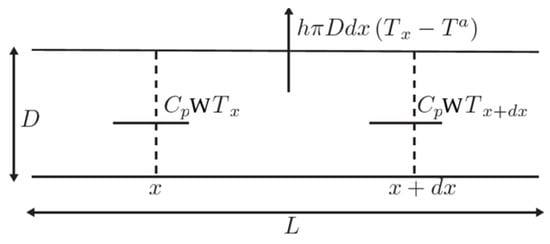 - An equation describing heat propagation along the pipeline—this equation can be written, by considering an infinitesimal volume along the pipeline (see Figure 5), as