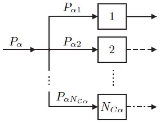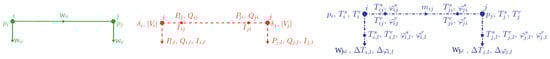 For distribution networks, the hypothesis that the longitudinal reactance of lines is usually much bigger than the relevant resistances does not hold, and thus, a direct current approximation cannot be made. However, for distribution networks, the DISTFLOW approach can be adopted. Such an approach retains an approximate calculation of reactive power alongside active power by applying opportune approximations so that the final solving system stays linear (for details, see [17,27]).