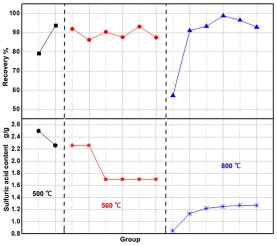 At an activation temperature of 500 °C, the recovery rate exceeded 80%. However, in this case, experiments with higher sulfuric acid quantities did not yield higher recovery rates than those with lower quantities. For instance, the recovery rate with higher sulfuric acid was 79.28%, while that with lower acid reached 93.86%. This inconsistency may result from the incomplete activation of the slag at 500 °C, leading to uneven distribution within the material and, consequently, unstable recovery rates.