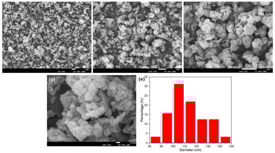 (a–d) SEM images of the as-prepared FePO4 at different magnifications; (e) particle size distribution histogram of FePO4.