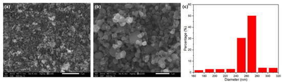 (a,b) SEM images of LiFeO4 at different magnifications; (c) particle size distribution histogram of LiFePO4.