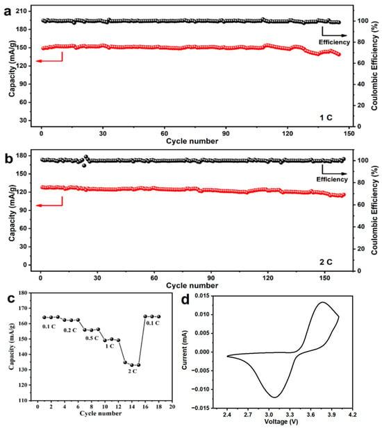 Using the previously prepared iron phosphate precursor as the raw material, LiFePO4 cathode material was regenerated. The images of the obtained LiFePO4 are shown in Figure 5. It can be observed that the prepared LiFePO4 cathode material exhibited a relatively uniform distribution with overall good dispersion, showing only slight agglomeration. Additionally, as shown in the charge and discharge curves in Figure 6, the regenerated LiFePO4 exhibited a discharge capacity of 160.7 mAh g−1, with a coulombic efficiency of 99%. This performance is nearly comparable to that of commercially available LiFePO4. Furthermore, measurements of the tap density revealed a value of 2.45 g cm−3. These results indicate that LiFePO4 synthesized from recycled iron phosphate has promising application potential.
