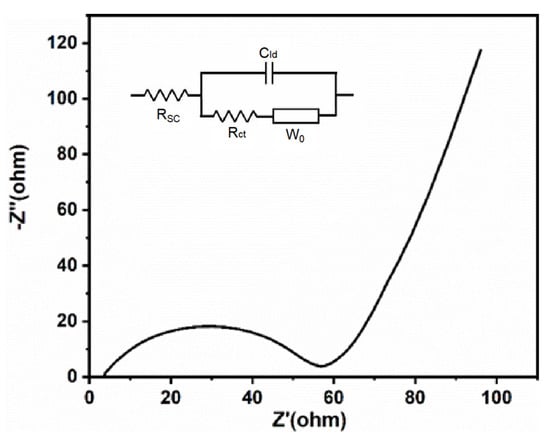 As shown in Figure 7a, the prepared LiFePO4 exhibited a reversible discharge capacity of 150 mAh g−1 at a current density of 1 C. After 145 cycles, it retained 92.75% of its initial capacity. Additionally, at 2 C, the initial specific capacity was 127.85 mAh g−1, and after 160 cycles, the capacity faded by only 9.56%, as shown in Figure 7b. Furthermore, its reversible specific capacities at 0.1 C, 0.2 C, 0.5 C, 1 C, and 2 C were 164.07, 162.33, 155.92, 149.88, and 134.77 mAh g−1, respectively (Figure 7c). According to the CV results (Figure 7d), the discharge plateau was at 3.4 V, and the charge plateau was just below 3.5 V, maintaining a small overpotential, which was consistent with the charge/discharge curves. The EIS results (Figure 8) showed that the internal resistance of the battery was only about 58 ohms, indicating excellent kinetics due to its relatively low internal resistance. Additionally, the Solution Resistance (RSC) was extracted from the high-frequency intercept (>104 Hz) on the real axis, with a fitted value of RSC = 5.2 Ω. This indicates low ohmic resistance due to the high ionic conductivity of the electrolyte and good electrode-electrolyte contact. The Charge Transfer Resistance (RCT) was determined from the diameter of the semicircle in the mid-frequency range (102–100 Hz), yielding a fitted value of RCT = 52.8 Ω. This reflects efficient charge transfer kinetics at the electrode/electrolyte interface, which is critical for fast Li+ intercalation/deintercalation. Furthermore, the Warburg Impedance (W0), represented by the linear slope in the low-frequency region (<10−1 Hz), is associated with solid-state Li+ diffusion; a near-45° slope confirms diffusion-dominated behavior.