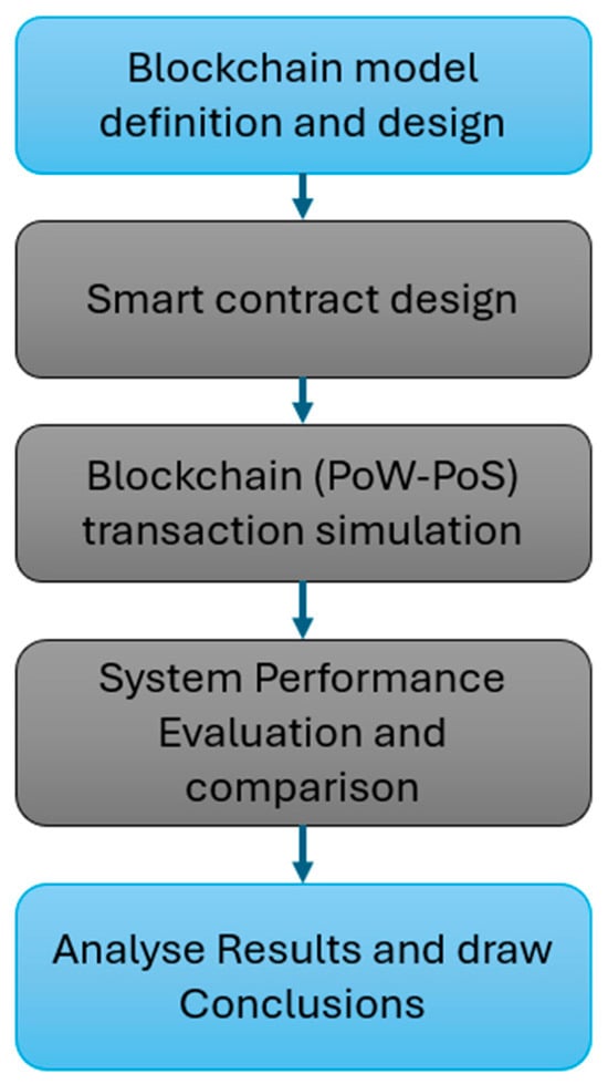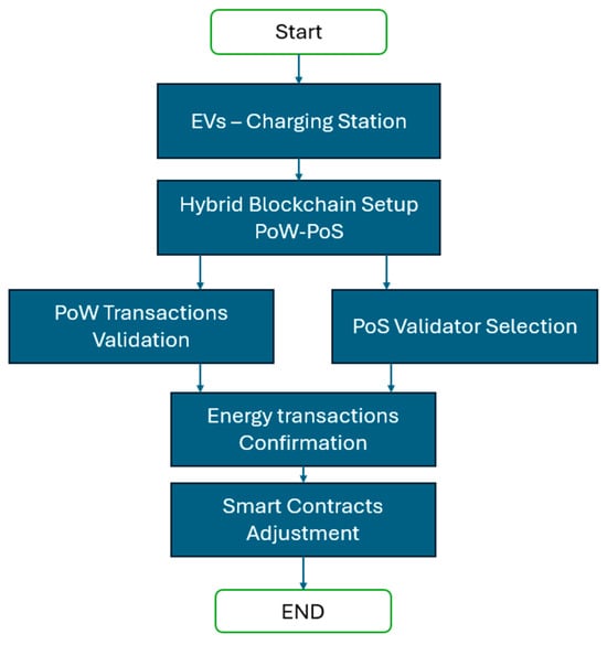 This research aims to design a hybrid PoW–PoS blockchain system to optimize decentralized energy trading in EV charging networks, addressing issues of high energy consumption, stake concentration, and scalability. This study evaluates the system’s performance in terms of energy efficiency, security, and scalability compared to existing models in the literature. The methodology involves selecting and designing the blockchain technology, designing the smart contract and simulating the system using MATLAB R2024a. Performance metrics, including energy consumption, transaction costs, and scalability, will be evaluated through simulations. The results will offer insights into the potential of hybrid blockchain systems for EV energy trading. Figure 1 represents the overall process of defining, simulating, and analyzing the blockchain models to assess the hybrid PoW–PoS model’s performance.
