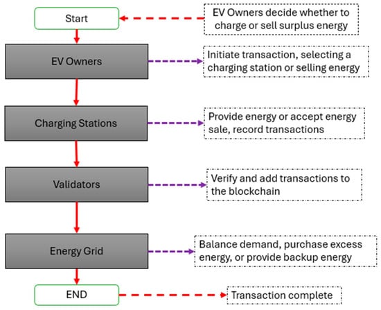 The validators play a critical role in maintaining the integrity of the blockchain. Through the selected consensus mechanism, such as Proof of Work or Proof of Stake, they verify the legitimacy of energy trading transactions and secure the system by resolving disputes. In return for their participation, validators are rewarded with transaction fees or energy credits. In more advanced setups, the energy grid can also function as a central authority. It regulates energy flow, provides backup energy during high demand, and facilitates energy transactions between EV owners, charging stations, and the grid. The grid helps balance supply and demand, ensuring energy availability during peak periods and enabling energy trading across various network participants (Figure 3).