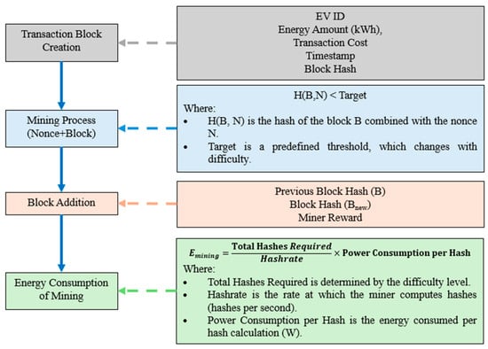 In this energy trading system, PoW ensures the integrity and security of transactions between EVs and charging stations. By using PoW, the system can prevent fraudulent transactions and ensure that all energy exchanges are securely validated before being added to the blockchain. The process is resource-intensive, especially regarding energy consumption. The mining process can be broken down as follows (Figure 5).