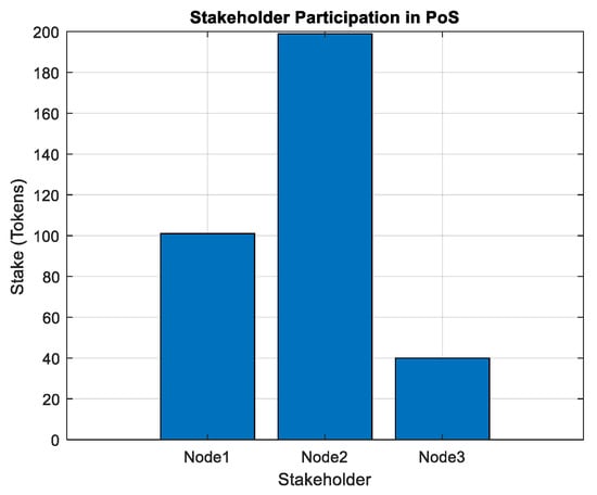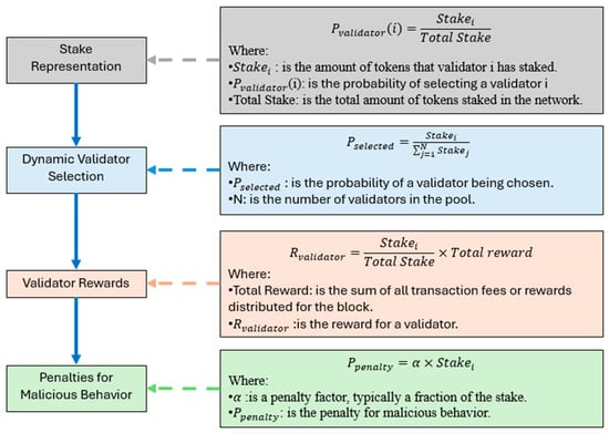 In the proposed model, Proof of Stake (PoS) selects validators based on their cryptocurrency stake, rewarding them with transaction fees. It is energy-efficient compared to Proof of Work (PoW), making it ideal for blockchain-based energy trading; it promotes decentralization, security, and sustainability, reducing carbon footprints while ensuring scalability. The selection process can be broken down as follows (Figure 6).