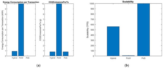 Table 2 illustrates that PoW exhibits the highest energy consumption, reaching 707.6 kWh per transaction. In contrast, PoS demonstrates remarkable efficiency, with energy consumption not exceeding 0.002 kWh. This stark difference underscores PoW’s high computational demands, as it requires substantial processing power to solve cryptographic puzzles for block validation [23].