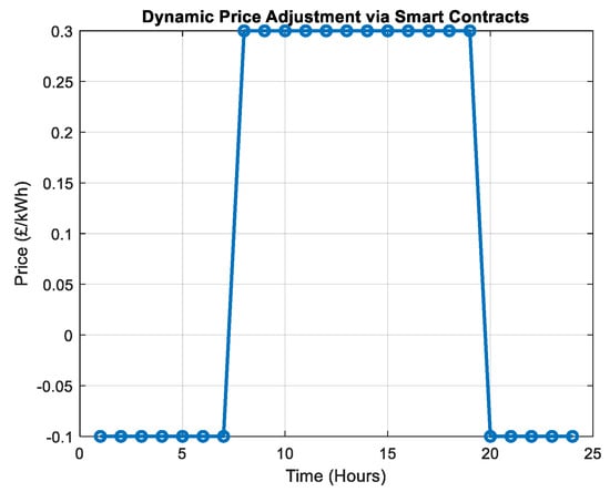 The smart contract monitors the current time, energy price £(t), and grid load demand G L ( t ) . During peak times or high demand, the price increases by a positive factor (α > 0), while during off-peak or low demand, it decreases by a negative factor (α < 0). The updated price is then recorded on the Blockchain, and the EV owner is notified of the price adjustment. The mathematical equation for RTP is as follows (Equation (4)):