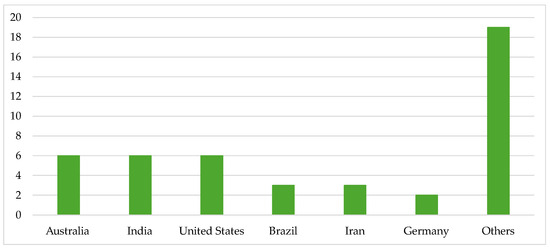 Figure 4 identifies the countries with the highest number of publications in the sample. Of the 45 documents analyzed, Australia, India, and the United States stand out with six publications each. Furthermore, China only has one publication, despite being one of the most important countries in the development of solar energy.